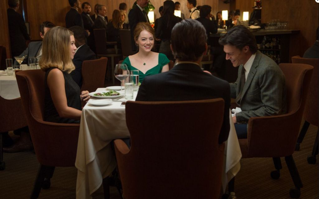 Before Mia and Sebastian’s relationship fully starts to blossom, the two go on a cinema date to watch ‘Rebel without a cause’. Mia however, forgets she had a prior engagement – a dinner with her boyfriend. In this scene Mia is dressed in an elegant green dress, whilst Greg (her then boyfriend) is in a rather dreary grey suit. The contrast in this scene is evident, with Mia’s green dress clearly juxtaposing the rest of the table’s black and grey outfits. The dull colours don’t last for long, as Mia leaves her boyfriend and his friends at the restaurant – running to meet Sebastian. As she bolts, the restaurants’ red light’s create a reminiscent atmosphere, recalling ideas of Mia and Seb’s forthcoming relationship. Once seated in the cinema, viewers are shown the contradiction between Greg and Sebastian – displayed by Seb’s outfit. Dressed in neutrals again, empyazing the comfort Mia feels around him.