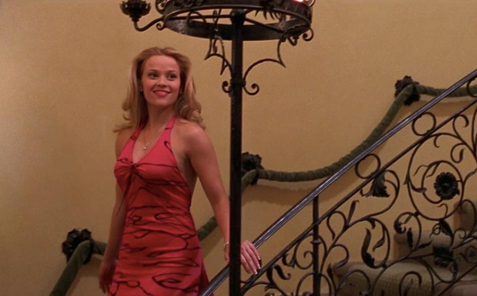 Within the first ten minutes of Legally Blonde, Elle is seen in this hot pink halter-neck dress – worn for a restaurant date with her boyfriend, Warner Huntington III. Regarding her hair, she has opted for her classic bouncy blowout, symbolising her bubbly and outgoing nature. The simple ‘Elle-ness’ of this outfit perfectly encapsulates Elle’s individuality, and how she is comfortable being portrayed as a ‘stereotypical blonde’. Ditzy, frivolous and bubble-headed. However, appearances can be deceiving and the audience is shown this within the first five minutes of the film – see 4:17 in Legally Blonde – allowing viewers to get a clear understanding that Elle is anything but a ‘dumb blonde’.