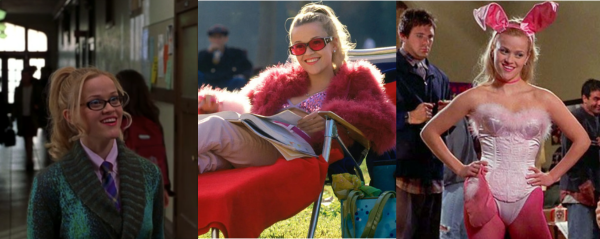During Elle’s first week at Harvard, she still maintains her personal style. As shown in the image above, pink is always included in an outfit. Whether its through a simple pink shirt, or a full-on sequin-pink bikini top. Likewise, Elle’s bunny costume is among the most iconic in the film, and cinema as a whole. Yet whilst others – Regina George, Bridget Jones, etc. – omit a sexy, seductive vibe; Elle’s costume doesn’t appear this way. Whether it’s the pink feathered border, hot pink tights , an actual bunny tail on her bum, or simply Elle’s persona that defines the bubbly tone of her look is up for interpretation. The fact is, Elle still feels comfortable in her own skin, regardless of the judgement from those around her. She is certain she will be able to win the respect of her peers just by being herself.